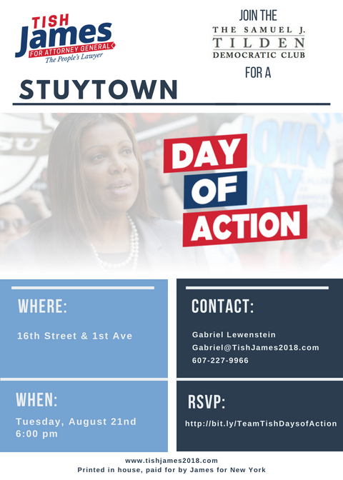 We will be talking to voters and distributing literature for New York State Attorney General Candidate Letitia “Tisch” James this Tuesday at 6pm. We hope you can join us at the 16th Street and First Ave!