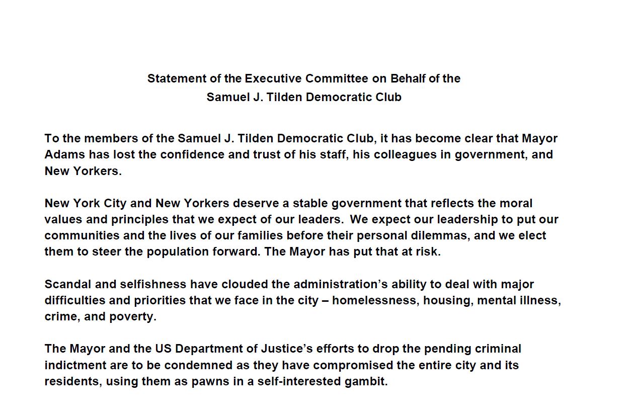 AnnouncementsStatement of the Executive Committee on Behalf of the Samuel J. Tilden Democratic ClubFebruary 19, 2025Statement of the Executive Committee on Behalf of the Samuel J Tilden Democratic Club – Concerning the Mayor
